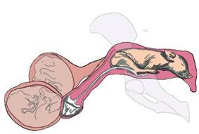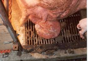 The presentation of a mass of placenta indicates the end of parturition. Normally within 4 hours of the last piglet. |