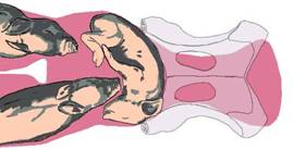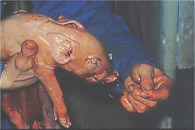 Be very careful about pulling on the lower jaw of the piglet, as fracture of the jaw is likely. If the piglet is overlarge or difficult to remove, a head rope applied around positioned behind the ears and into the mouth, together with two leg ropes will greatly assist the piglet to be farrowed. |