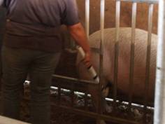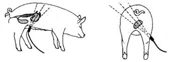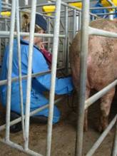 Using an extension allows the probe to be places accurately without the operator bending down, very useful for loose sows and also for restrained sows – as shown above. Note probe wire held in place by cable ties. |