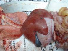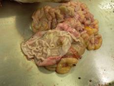 stomach may be filled with fluid and possibly just straw (if housed on