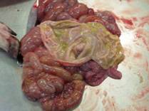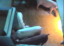 Weaners eating out of a trough feeder/ Be concerned about the pig arrowed. |