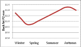 Look at backfat over time check for seasonal impact The P2 changes with the time of the year pigs are fatter going into autumn as they eat more as the weather cools off and they are thinner in the early summer as they grow better. Note the effect is also on the weaners growth and fat deposition |